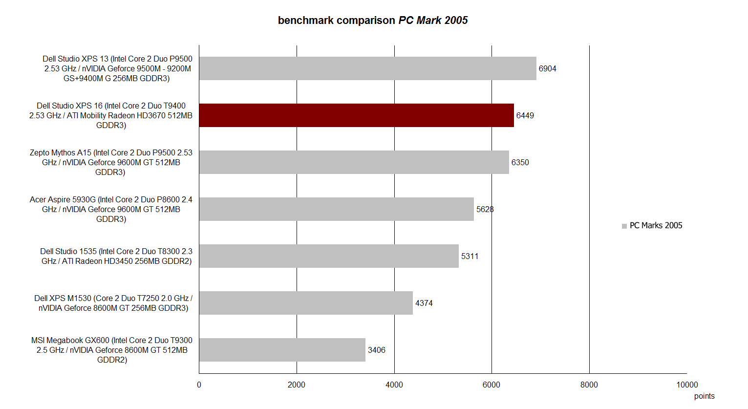 Durchaus gut fällt das Ergebnis im Anwendungsorientierten PC Mark 2005 Benchmarktest von Futuremark aus. Mit 6449 Punkten zählt das Studio XPS 16 zu den leistungsfähigsten Geräten seiner Klasse, sofern man 17“ Desktop Replacements ausklammert. Auffällig im Benchmarkvergleich wird aber auch, dass das Studio XPS 16 hinter dem Ergebnis des offenbar leistungsschwächeren Studio XPS 13 bleibt.