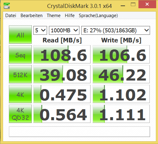 Wir haben eine externe USB-3.0-Festplatte (2 TB; 2,5 Zoll) an die Docking-Station angeschlossen und mit CrystalDiskMark die Transfergeschwindigkeit überprüft. Anschließend haben wir das Ganze direkt am USB-3.0-Anschluss unseres Notebooks wiederholt. Die Transferraten sind in beiden Fällen gleich.