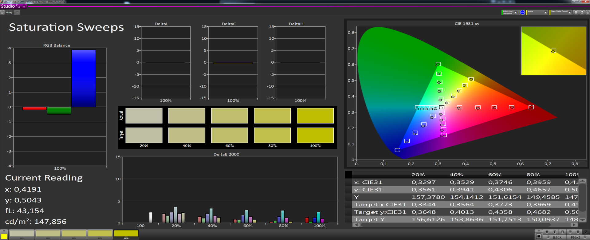 Nach der Kalibrierung mit unserem Xrite i1 Pro 2 Spektralfotometer fallen die DeltaE Abweichungen auf 2,73 bei den Graustufen und 1,81 im Colorchecker.