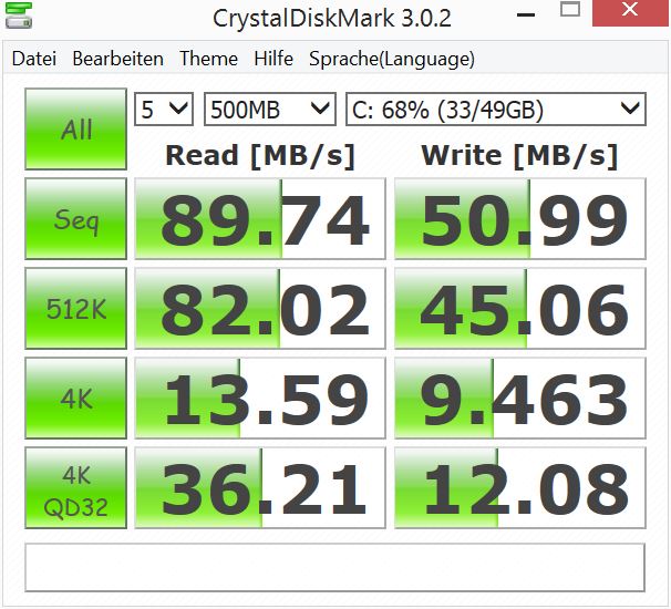Wir haben bereits angedeutet, dass der eMMC-Speicher ein limitierender Faktor sein kann. Der eMMC-Standard bietet einige spezielle Funktionen, wie das Sperren von Partitionen (Recovery-Partition kann nur gelesen werden) oder die Fehlerkorrektur, aber bei der Geschwindigkeit kann er es nicht mit der SATA-Schnittstelle aufnehmen. Die Speichergeschwindigkeit des Dell Venue 10 Pro ist sogar etwas niedriger als erwartet. Das alte Lenovo Miix 2 10 kann das Venue 10 Pro erneut schlagen. Den Speichertest haben wir direkt am Anfang der Testperiode durchgeführt, wir haben den Test aber noch einmal bei einem Speicherstand von 68 % und aktiviertem Bitlocker wiederholt. Im sequentiellen Lesetest sind die Ergebnisse niedriger, was bedeutet, dass die hardwarebasierte Verschlüsselung die Festplatte bei diesen anspruchsvollen Operationen an die Grenzen bringt. Dem Anwender sollten im Alltag aber keine großen Unterschiede auffallen und der Sicherheitsvorteil ist offensichtlich.