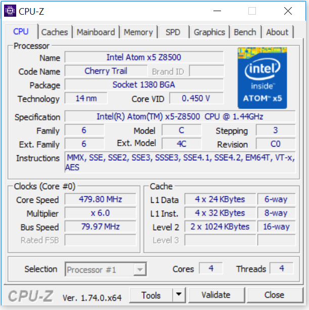 Im Inneren des Tablets steckt ein Atom x5 Z8500 (Cherry Trail) Vierkernprozessor. Dank ihrer sehr niedrigen TDP (kleiner 4 Watt) kann die CPU passiv gekühlt werden. Der Prozessor arbeitet mit einer Basisgeschwindigkeit von 1,44 GHz. Mittels Turbo ist eine Steigerung auf bis zu 2,24 GHz möglich. Eine dauerhafte Entfaltung der vollen Geschwindigkeit konnten wir nicht feststellen. Während der Ausführung von Single-Thread-Tests springt die Geschwindigkeit der CPU zwischen 1,5 und 2,24 GHz hin und her. Dazwischen liegende Geschwindigkeiten werden ausgelassen. Multi-Thread-Tests beginnt der Prozessor mit voller Kraft. Im weiteren Verlauf sinkt die Geschwindigkeit. So liegt die Geschwindigkeit am Ende der Ausführung des Multi-Thread-Tests des Cinebench R15 Benchmarks bei 1,84 GHz.