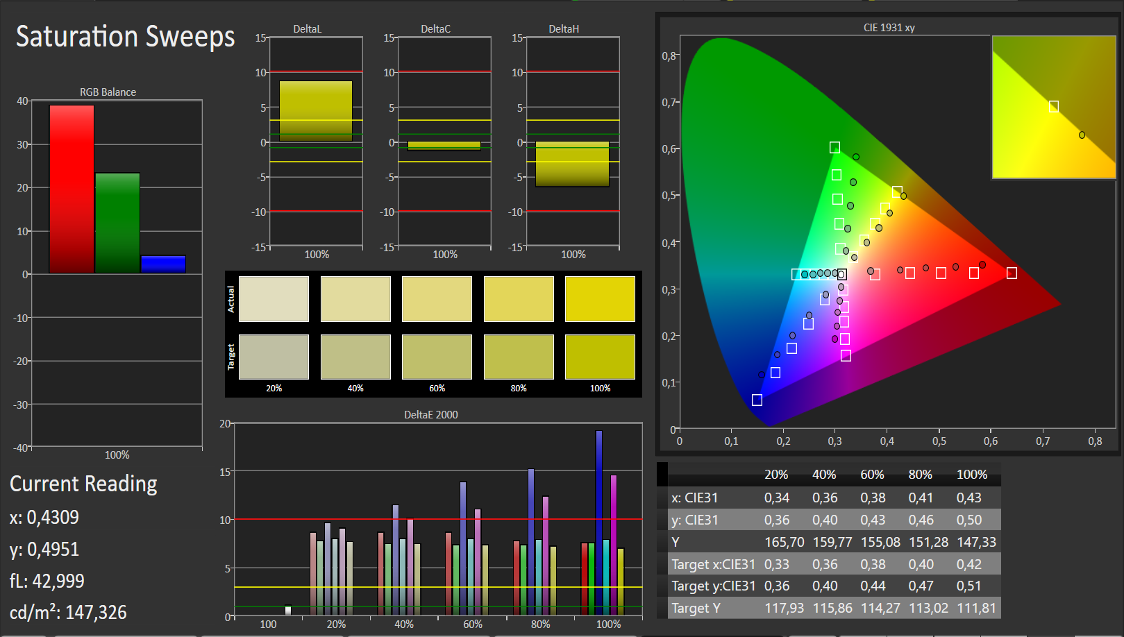Im Auslieferungszustand zeigt der Bildschirm eine DeltaE-2000-Farbabweichung von 8,31. Anzustreben wäre ein Wert kleiner 3. Unter einem Blaustich leidet das Display nicht. Die Farbräume AdobeRGB und sRGB können nicht dargestellt werden. Die Abdeckungsraten liegen bei 38 Prozent (AdobeRGB) bzw. 60 Prozent (sRGB).