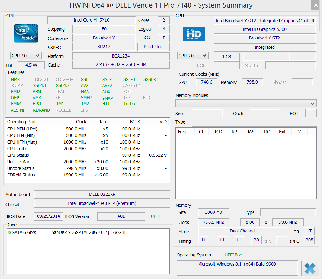 | Dell Venue 11 Pro 7140 HD Graphics 5300, 5Y10a, Sandisk X110 M.2 SD6SP1M-128G | Lenovo ThinkPad Helix HD Graphics 4000, 3317U, Intel SSD 525 Series SSDMCEAC180A3L | HP Pro X2 410 G1 HD Graphics 4200, 4202Y, Sandisk X110 SD6SN1M-256G-1006 | HP EliteBook Revolve 810 G2 HD Graphics 4400, 4300U, Lite-On IT L8T-128L6G-HP | Toshiba Portege Z10t HD Graphics 4000, 3339Y, Toshiba THNSNF256GMCS | |