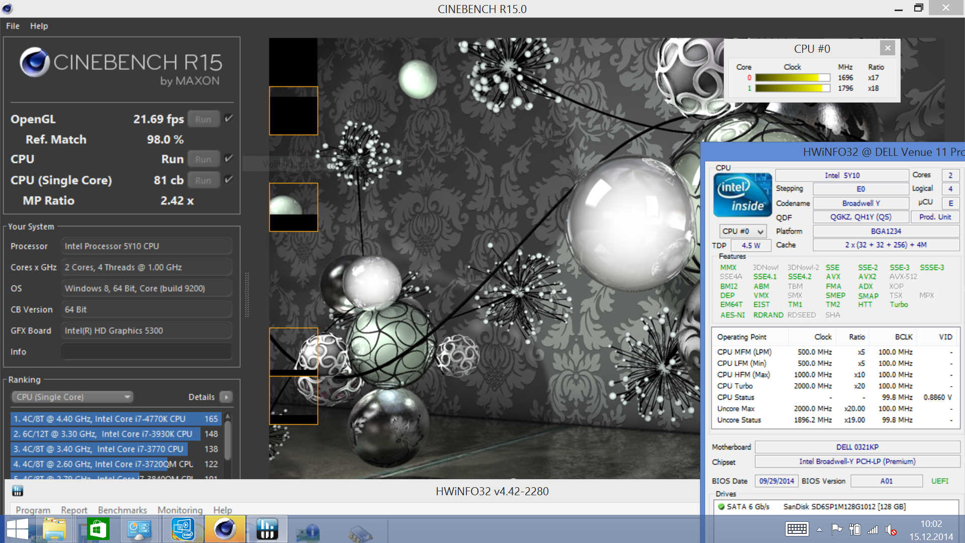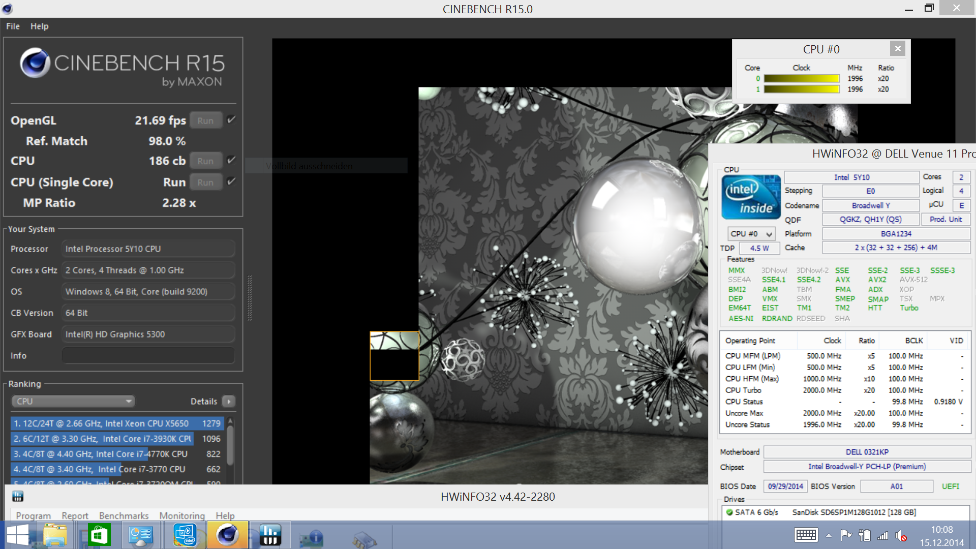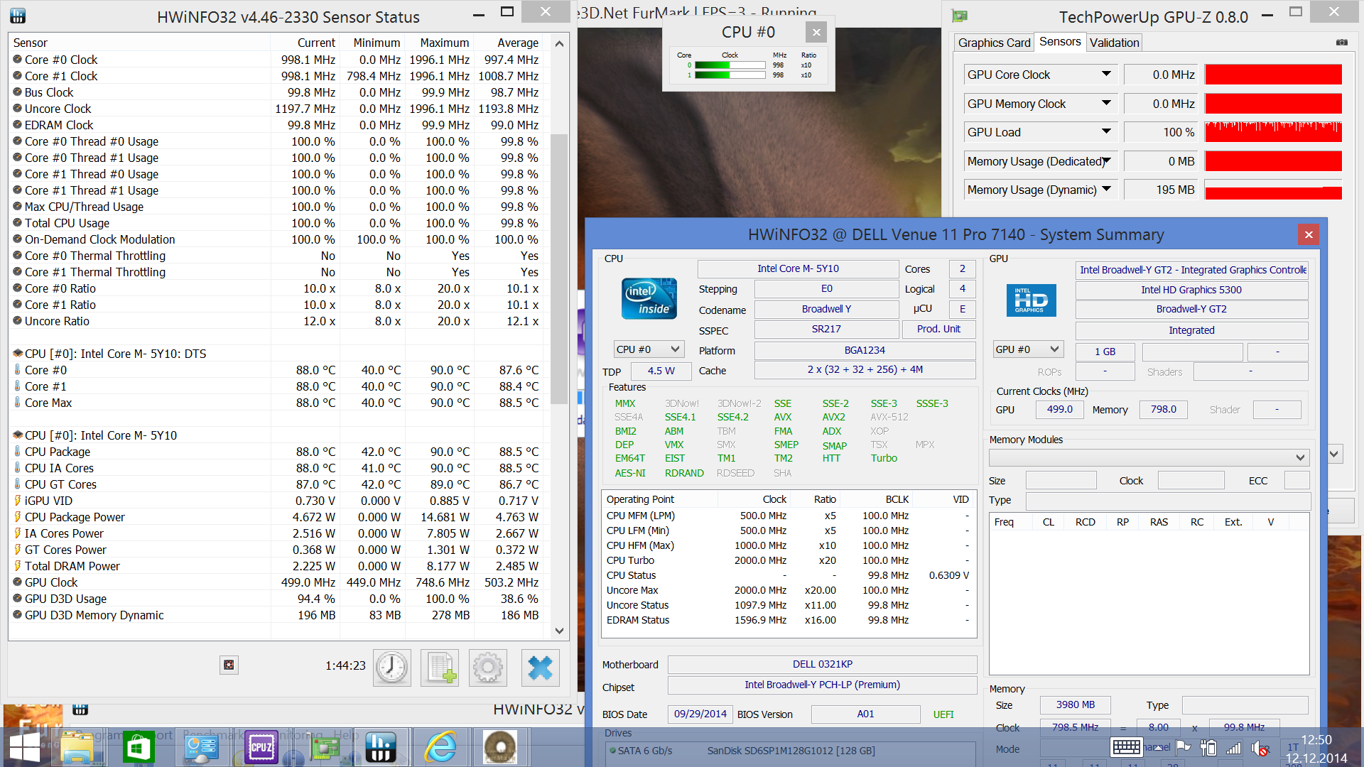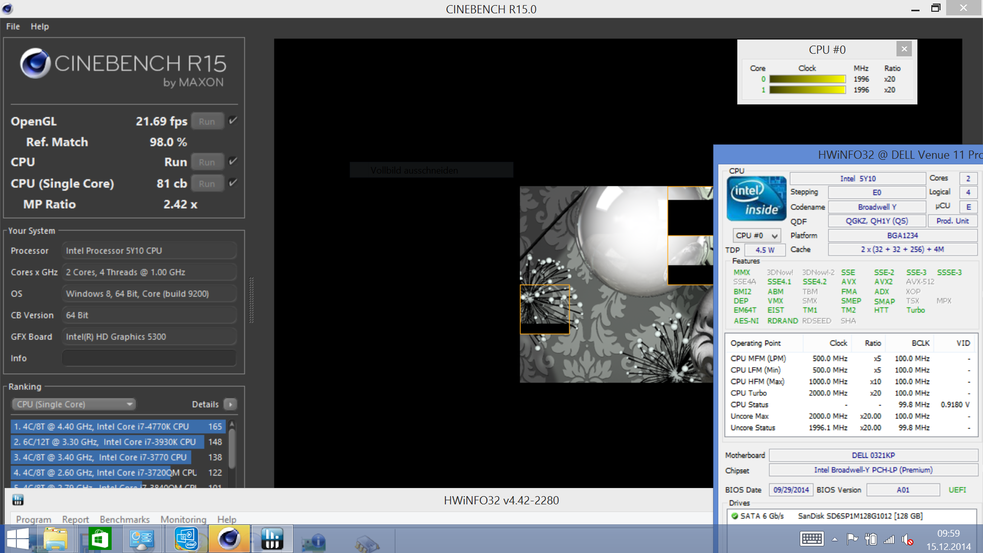 Die Turbo-Range von 800 bis 2.000 MHz nutzt das Venue aus, beim Rechnen auf allen Kernen aber nur Beginn. Schnell sinkt der Takt bei andauernder Last auf 1,7-1,8 GHz. Ein Kern kann jedoch konstant mit 2,0 GHz rechnen. Das ist der Grund für die sehr guten CPU-Scores dieses Core M. Dass dies nicht der Normalfall ist, das beweist das HP Envy x2 15-c000ng mit gleicher Broadwell SoC. Hierbei handelt es sich um einen 15,6-Zoll-Tablet mit ungleich mehr passivem Kühlungsspielraum.