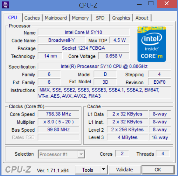 Der Intel Core M 5Y10a (800 MHz) gehört zur neuen Broadwell-Architektur für leistungsstarke Windows-Tablets. Seine Stärke ist die hohe Pro-MHz-Leistung bei einer sehr geringen Leistungsaufnahme im Vergleich zu den Haswell-Vorgängern. Die TDP liegt bei 4,5 Watt, der vergleichbare Vorgänger Core i5 4202Y bemaß sich noch mit 11,5 Watt. Integriert ist nun die HD Graphics 5300 (100 bis 800 MHz) statt der HD 4200. Die Daten sind auf einem M.2-Modul gespeichert, einem Sandisk X110 SD6SP1M-128G. 75 GB sind davon für den Nutzer verfügbar, ein Teil geht wie üblich bereits für die Recovery Partition drauf.