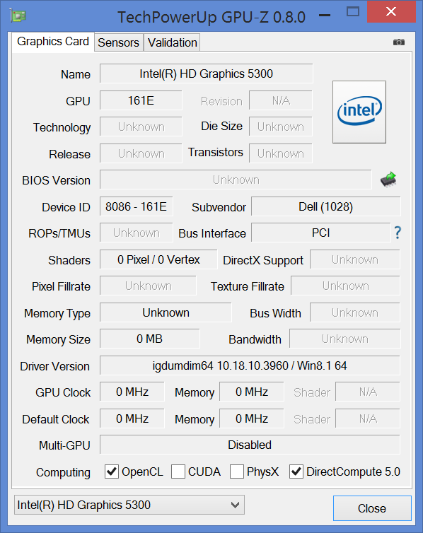 Die HD Graphics 5300 (100 - 800 MHz) kann im Idle noch niedriger takten als ihre Vorgängerin HD 4200. Ihre Ergebnisse in den 3D-Benchmarks fallen zirka 10-15 % besser aus, als mit der HD 4200, z.B. im Z10t. Insgesamt bewegt sich die IGP aber auf einem sehr niedrigen Niveau, das eine Haswell-HD-4400 (Surface Pro 3, Revolve 810) knapp übertreffen kann (~20 %).