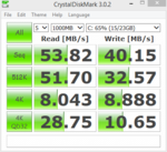 Der 32 GB große Samsung MBG4GC eMMC-Flashspeicher stellt keine neuen Geschwindigkeitsrekorde auf: Die Lesegeschwindigkeit liegt laut CrystalDiskMark bei rund 54 MB/s, was deutlich unter den Flashmodulen im Acer Iconia W3-810 und dem Asus Transformer Book T100TA mit 82 bzw. 109 MB/s liegt. Die Leistung bei 4K-Blöcken (lesen) ist allerdings recht gut mit 8 MB/s, und die geringe Zugriffszeit von 0,4 ms garantiert ein flottes System.