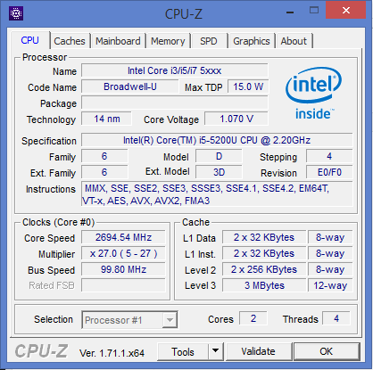 Unser Testgerät ist mit dem Core i5-5200U (Broadwell) Zweikernprozessor ausgestattet. Hierbei handelt es um eine Mittelklasse-CPU. Einen stärkeren Prozessor bietet Dell innerhalb der Vostro-3558-Reihe aktuell nicht an. Es sind aber leistungsschwächere Modelle zu bekommen. Der Core-i5-Prozessor arbeitet mit einer Basisgeschwindigkeit von 2,2 GHz. Mittels Turbo kann die Geschwindigkeit auf 2,5 GHz (beide Kerne) bzw. 2,7 GHz (nur ein Kern) erhöht werden. Die volle Rechenleistung des Prozessors kann sowohl im Netz- als auch im Akkubetrieb abgerufen werden. Die von uns durchgeführten Tests werden stets mit voller Geschwindigkeit bearbeitet.