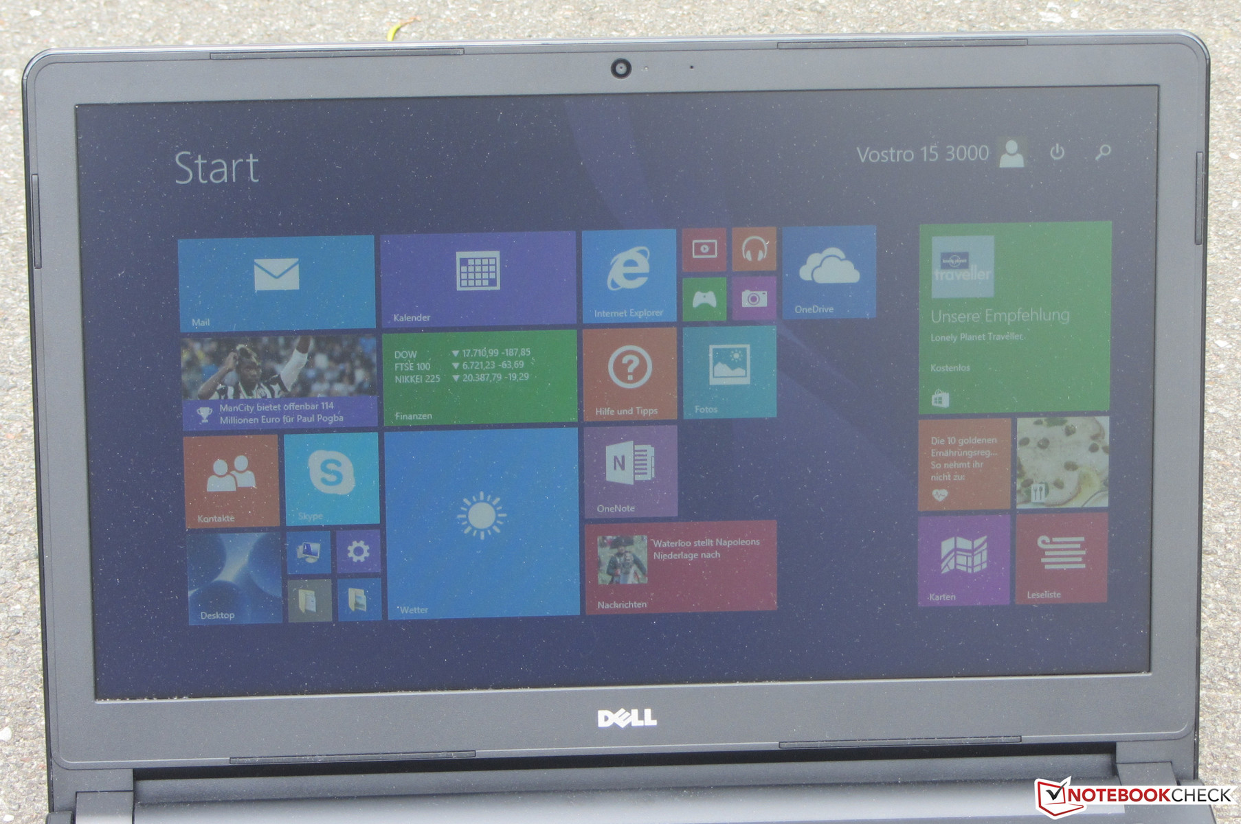 Dell hat das Vostro mit einem blickwinkelinstabilen TN-Panel ausgestattet. Somit kann der Bildschirm nicht aus jeder Position heraus abgelesen werden. In horizontaler Richtung ist der Winkel recht großzügig bemessen. Mehrere Personen können gleichzeitig auf das Display schauen. Eine Änderung des vertikalen Blickwinkels führt hingegen schnell zum Einbruch des Bildes. Der Rechner kann durchaus im Freien genutzt werden. Die Sonne sollte nur nicht allzu hell scheinen.