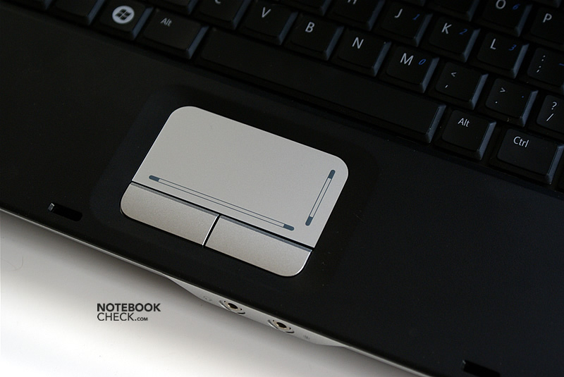 Das Touchpad wirkt rau und etwas plump, als ob es auf einer leicht ansteigenden Ebene liegen würde. Im Verhältnis zur Tiefe ist es sehr breit, wobei es 69x37 Millimeter misst. Aufgrund der Abmessungen ist es praktisch nicht möglich in vertikaler Richtung den Cursor auf eine angenehme Art und Weise zu bewegen. Noch dazu sind die Standardeinstellungen ab Werk völlig ungeeignet - der Mauszeiger bewegt sich langsam und man kann nicht wirklich von Präzision sprechen.