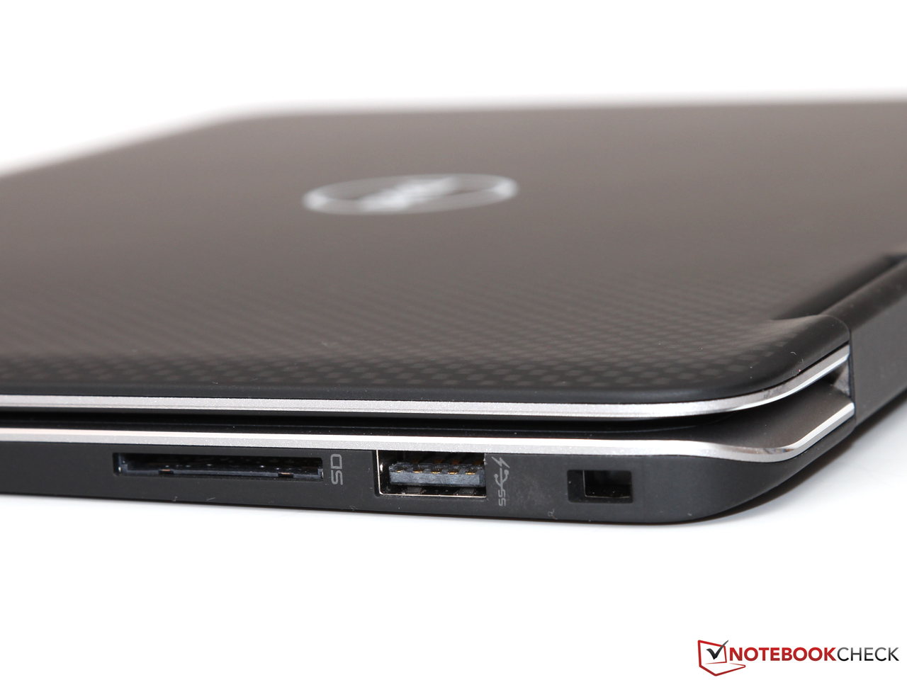 Alle Schnittstellen konzentrieren sich im hinteren Bereich der Seitenkanten, sind durch die geringen Gehäusemaße aber dennoch jederzeit gut erreichbar. Konstruktiv bedingt muss man das gesamte Notebook beim Anstecken eines dicken USB-Sticks übrigens leicht ankippen; hierbei sollte der Anwender darauf achten, dass Stecker und Buchse nicht allzu sehr belastet oder gar verbogen werden.