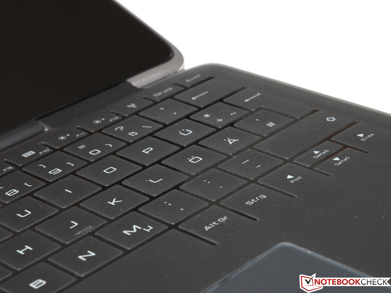 Im ersten Moment ist das fehlende haptische Feedback sehr irritierend und führt zu zahlreichen Fehleingaben, auch weil man den notwendigen Kraftaufwand beim Tippen unterschätzt. Anders als bei einem Touchscreen bedarf es recht kräftiger Anschläge, wodurch die Finger auf Dauer schneller ermüden. Das eigentliche Treffen der auf Wunsch auch beleuchteten Tasten fällt dagegen relativ leicht – ähnlich einer Chiclet-Tastatur trennt ein fühlbares Raster die einzelnen Buchstaben voneinander. Letztendlich hängt es vom Anwender selbst ab, ob er sich mit diesen Eigenarten arrangieren kann; zum produktiven Arbeiten würden wir jedenfalls den Anschluss einer externen USB-Tastatur anraten.