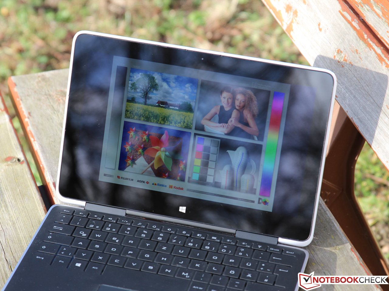 Trotz seiner verspiegelten Oberfläche ist das XPS 11 mit leichten Einschränkungen für den Außeneinsatz geeignet. Die kräftige Hintergrundbeleuchtung kann entstehende Reflexionen in den meisten Situationen recht gut überdecken, einzig im direkten Sonnenlicht erkennt man den Bildinhalt nur schwer. Auch eine noch höhere Helligkeit würde hier nur wenig helfen – ein mattes Display schon eher, was sich jedoch nur schwer mit dem Touchscreen vereinen lässt.