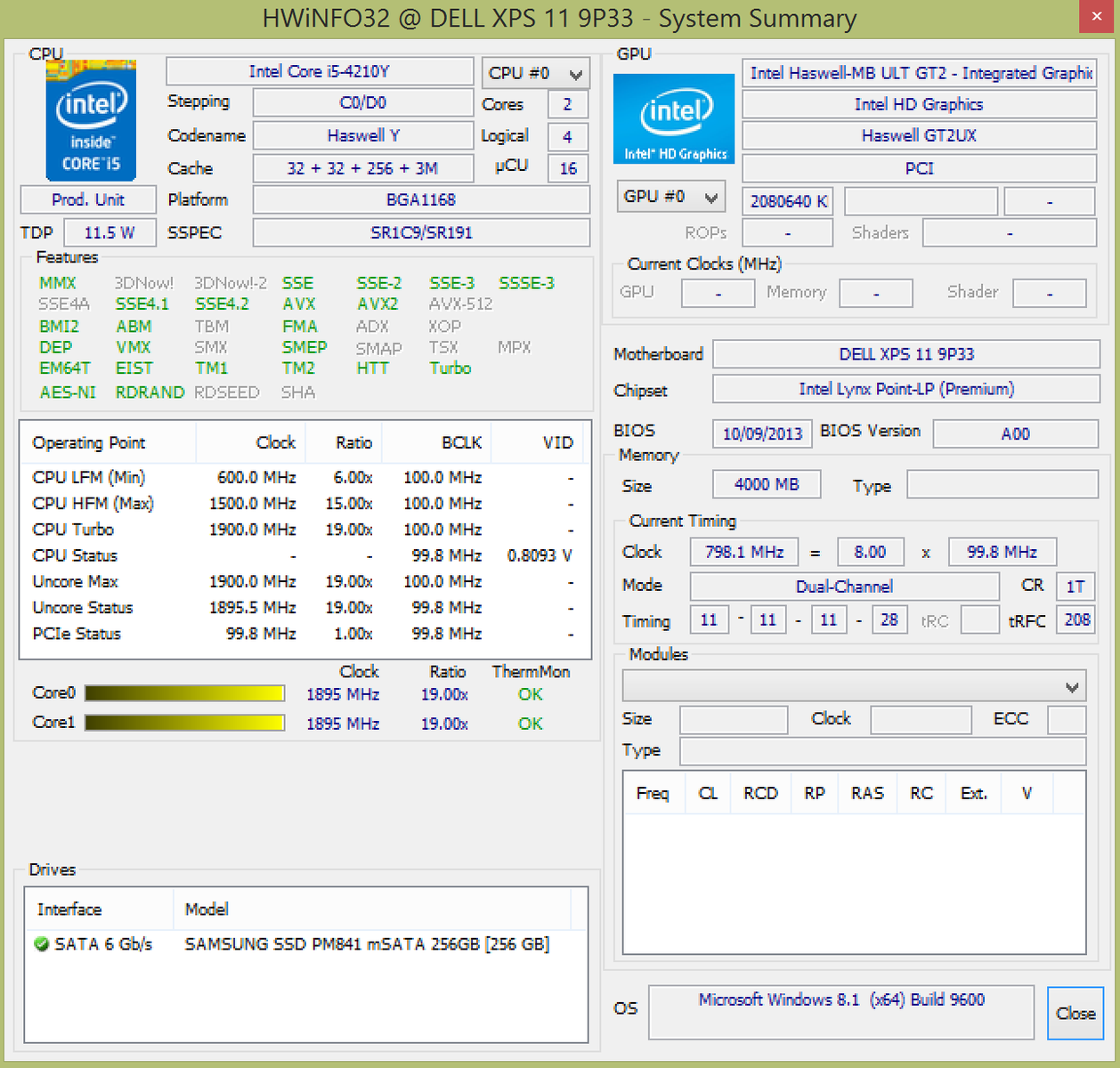 Das kompakte und schlanke Gehäuse des XPS 11 würde die Abwärme einer normalen 15-Watt-CPU (z. B. Core i5-4200U) wohl nur mit Mühe abführen können, weshalb sich Dell für einen Prozessor aus der noch sparsameren Y-Serie entschieden hat. Der Core i5-4210Y ist mit einer TDP von lediglich 11,5 Watt spezifiziert, was allerdings auf Kosten der Taktrate geht: Diese fällt mit 1,5 bis 1,9 GHz (maximaler Turbo) ebenfalls recht niedrig aus. Das Featureset wurde hingegen nicht angetastet und umfasst auch weiterhin Techniken wie Hyper-Threading, AES-NI oder AVX(2). Alle Details hält wie immer unsere CPU-Datenbank bereit.