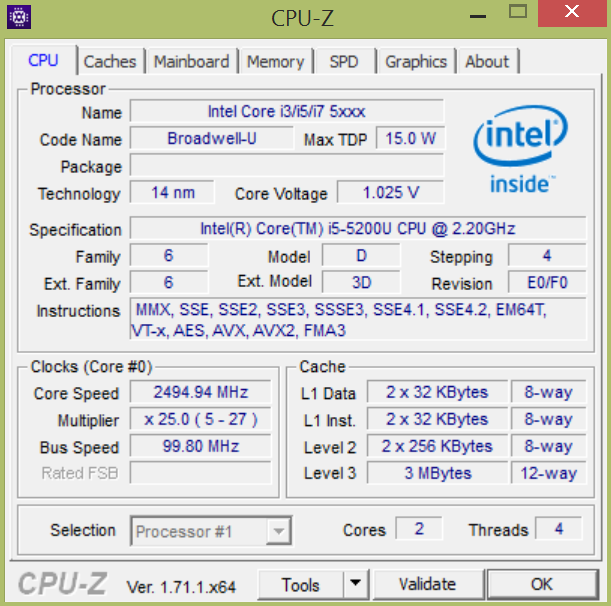 Der Intel Core i5-5200U ist ein ULV-Prozessor der Broadwell-Generation. Der Basistakt liegt bei 2,2 GHz, allerdings kann der Chip dank dem eingebauten Turbo Boost bis zu 2,7 GHz für einen Kern sowie 2,5 GHz für beide Kerne erreichen. Die Cinebench R11.5-Ergebnisse liegen mit 2,85 (Multi) und 1,28 Punkten (Single) ganz leicht über dem kürzlich getesteten Lenovo Yoga 3 14 mit derselben CPU. Interessanterweise kam die Touchscreen-Version unseres Testgerätes, welches ebenfalls mit der gleichen CPU ausgestattet war, nur auf 2,33 bzw. 0,98 Punkte – etwa 20 % weniger. Die anderen Cinebench-Versionen (R10, R15) bestätigen die Ergebnisse des R11.5. Verschiedene andere synthetische CPU-Tests – beispielsweise SuperPi und wPrime – zeigen ebenfalls einen Vorteil für das Testgerät, auch wenn der Unterschied hier nicht ganz so groß ist. Zu diesem Zeitpunkt haben wir leider keine Erklärungen für die Unterschiede, denn beide Ultrabooks verhalten sich in den Stresstests für die CPU und die GPU beinahe identisch.