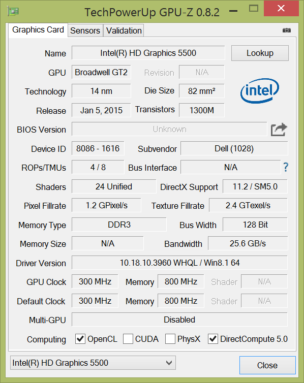 Um die Grafikausgabe kümmert sich die integrierte HD-Graphics-5500-GPU mit einem Takt zwischen 300 - 900 MHz. Die Leistung der Grafikkarte liegt etwa 10 - 20 % über den vorherigen integrierten Modellen (Haswell HD Graphics 4400 und HD Graphics 5000). Die Leistung beim Spielen gehört nicht zu den Stärken des XPS 13, aber das Ziel der integrierten Grafikkarte ist auch ein guter Kompromiss aus Grafikleistung und Stromverbrauch. Dementsprechend lassen sich nur ältere und anspruchslose Titel spielen, anspruchsvolle Titel sind selbst mit den niedrigsten Einstellungen und der geringsten Auflösung nicht spielbar. Gute Nachrichten: 3DMark 11 zeigte nur minimale Unterschiede im Netz- und Akkubetrieb, damit steht die volle Leistung auch abseits der Steckdose zur Verfügung.