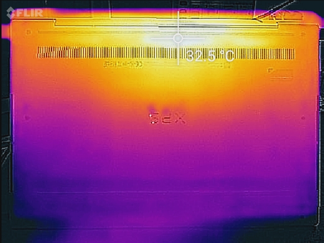 Die Wärmeentwicklung auf der Oberfläche ist größtenteils symmetrisch, die heißesten Stellen konzentrieren sich auf die Tastaturmitte und den hinteren Bereich der Unterseite. Die Tastatur erreicht maximal fast 49 °C, wohingegen die wärmste Stelle beim HP Spectre x360 13, welches mit der gleichen CPU ausgerüstet ist, weiter hinten und damit auch weiter von der Tastatur entfernt liegen. Der vordere Bereich des Gehäuses wird nie unangenehm warm, da er hauptsächlich den Akku beherbergt.