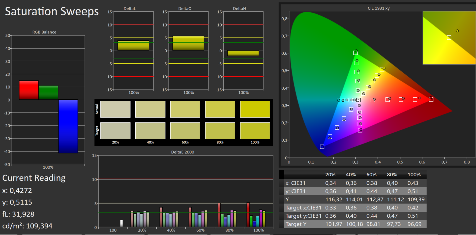 Während sich die Vermessung des Fotospektrometers vor der Kalibrierung bis auf die Helligkeit kaum verändert, sehen wir mit CABC-Off ein deutlich besseres Post-Kalibrations-Resultat. Das DeltaE der Graustufen sinkt auf ein erstklassiges 0,7, das vom Color Checker auf 1,0. Das unterscheidet sich deutlich von den obigen Ergebnissen der Kalibrierung.