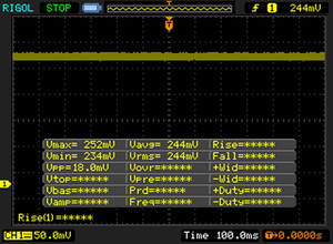 Ergänzung Reaktionszeiten 50% Grau zu 80% Grau: Das PWM-Flackern sorgt für eine dicke Linie (Bild 2). In einem Bereich von 500 Mikrosekunden schaut der Begin eines Rise so aus wie in Bild 1 (Anstieg beginnt hier). Die Messung fand bei max. Luminanz statt und blieb mit/ohne Netzteil unverändert.