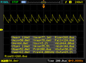 Bei Maximaler Helligkeit (Bild 1) zeigt das Signal kein Flackern mehr, es setzt bei 80 % Luminanz aber wie gehabt mit gleicher Charakteristik bei 4.800 Hz ein. Eine Reduzierung der Helligkeit in Richtung Minimum intensiviert wie gehabt das Auf und Ab (Bild 2, 50 % Luminanz), die Frequenz bleibt aber gleich.
