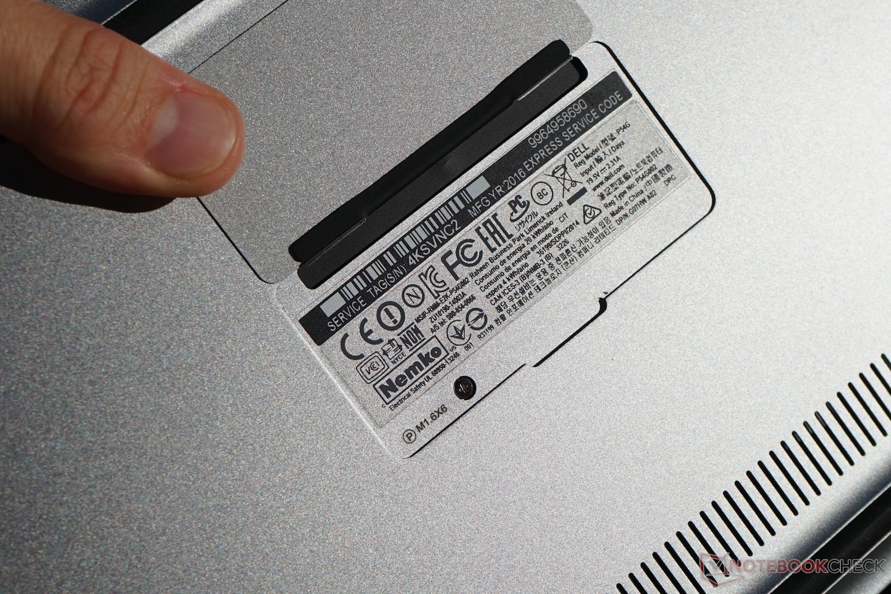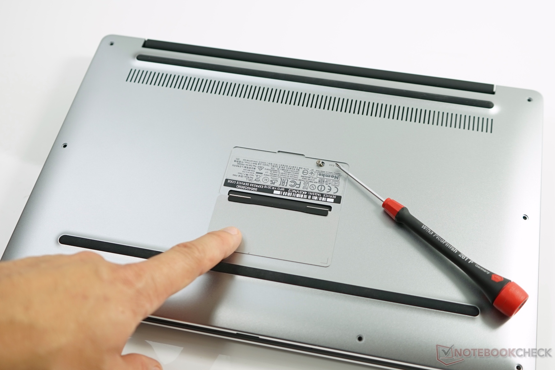Die inneren Komponenten erreicht man beim XPS 13, wie auch schon bei den Vorgängern, durch Abnahme der Bodenplatte. Diese ist durch 8 Torqx T4 Schrauben und eine Kreuzschraube (unter der magnetischen Mittelklappe) und Kunststoffpins gesichert. Zuerst entfernt man die 9 Schrauben und dann kann man mit einem einem Stanleymesser Platz für eine Kreditkarte schaffen. Mit dieser geht man nun rund um das Gehäuse um die Bodenplatte zu lösen. Danach erreicht man WLAN Karte, M.2 SSD, Akku und Lüfter zur Wartung. WLAN Karte und SSD kann man problemlos tauschen. Der Lüfter und Kühlkörper ist ebenfalls einfach zu reinigen.