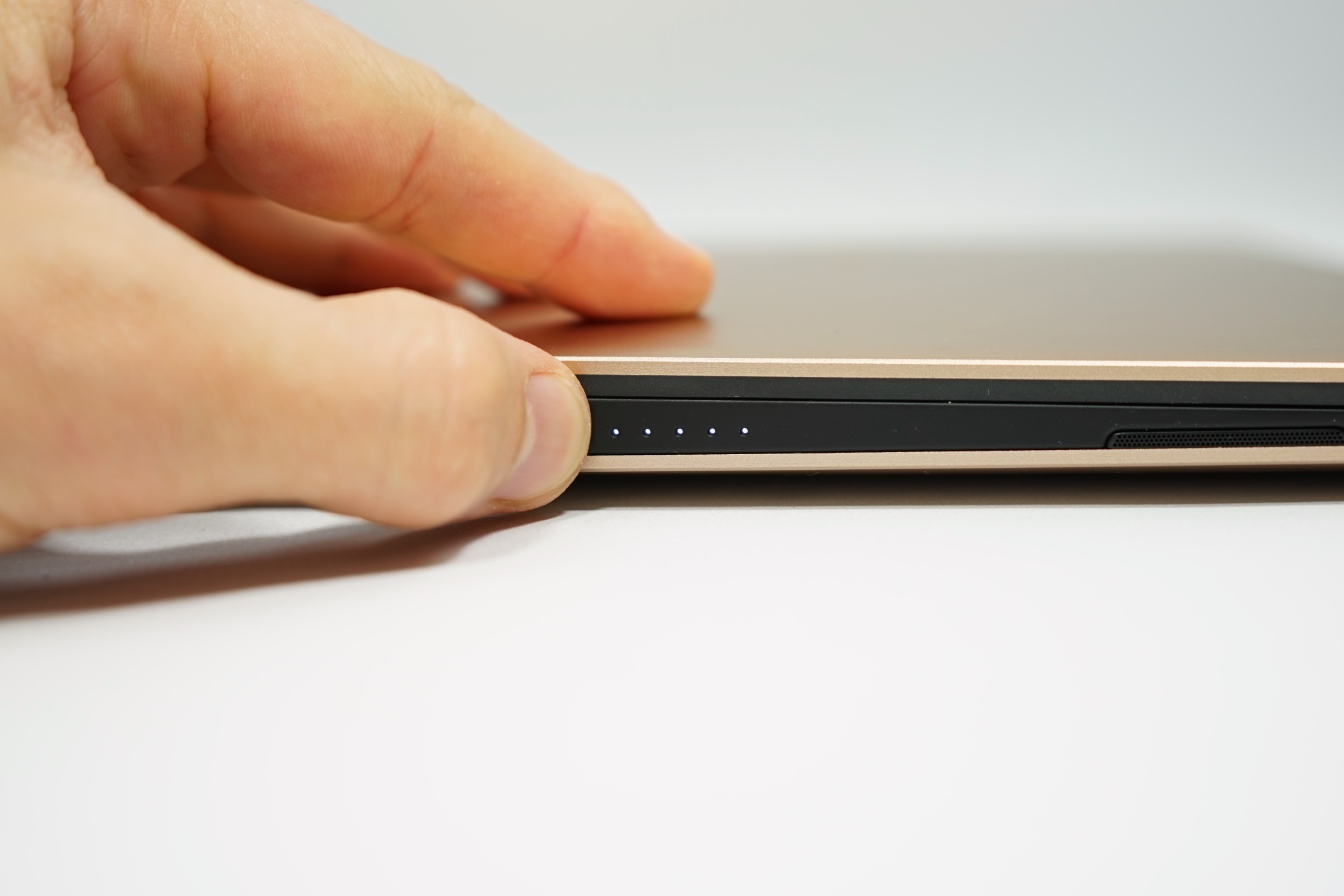 Die 1-W-Lautsprecher sind unbeeindruckend und vergleichsweise unausgewogen. Die Wiedergabe von höheren Tönen ist, wie unsere Mikrofon-Messungen zeigen, schwach. Von einem Subnotebook dieser Größe ist dies zu erwarten, der Vergleich mit dem MacBook 12 fällt dennoch ernüchternd aus. Für längere Sessions sind daher Kopfhörer oder externe Lautsprecher empfehlenswert. Allerdings erzeugt maximale Lautstärke kein statisches Rauschen oder störendes Nachhallen des Chassis.