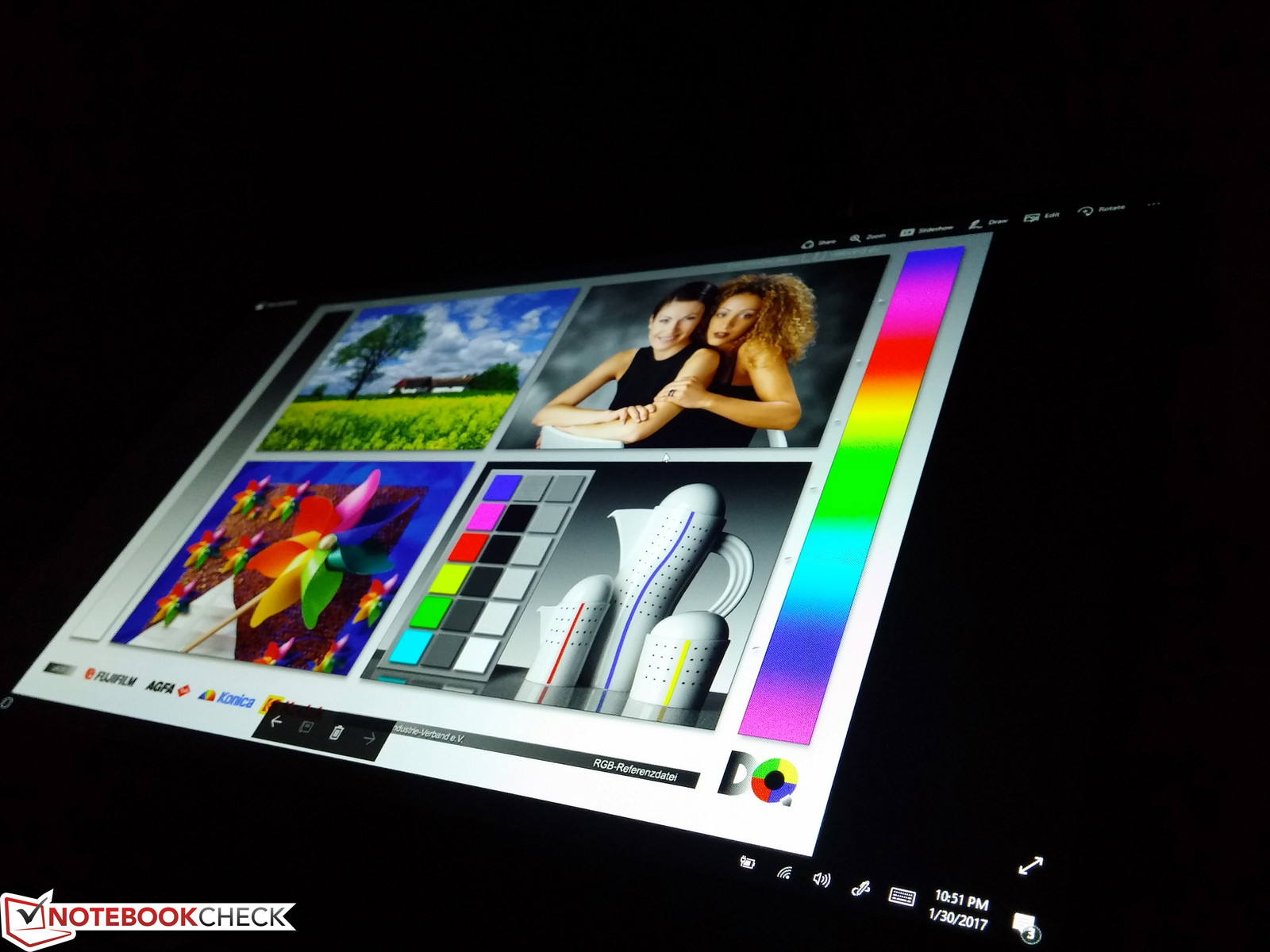 Die Farbraumabdeckung beträgt zirka 70 Prozent bzw. 44 Prozent der sRGB- bzw. AdobeRGB-Standards. Damit ist dieser viel kleiner als bei den Bildschirmen des Yoga 910, Spectre x360 13 oder Zenbook UX310UQ, welche alle zirka 90 % von sRGB schaffen. Während dies Web-Surfen und Textverarbeitung nicht wesentlich beeinträchtigt, könnte dies für Photo-Enthusiasten etwas enttäuschend sein, denn es handelt sich ansonsten um ein attraktives Display.
