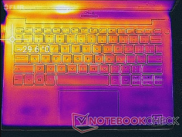 Im Stresstest mit Prime95 und FurMark messen wir maximal 43 °C im Bereich der Taste "2". Genau darunter befindet sich der Prozessor. Damit sind die Oberflächentemperaturen tatsächlich einige Grad geringer als beim XPS 13 9360. Der Hotspot ist immer noch recht warm, doch beim Tippen oder selbst dem Spielen wird es nicht unangenehm. Wir hatten gehofft, dass die GORE-Isolierung dem XPS 13 einen Vorteil vor der Konkurrenz verschafft, doch im Endeffekt bringt sie das XPS auf ein durchschnittliches Temperaturniveau.