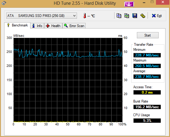 Aufgrund des flachen Gehäuses hat sich Dell zu einem Massenspeicher im mSATA-Format entschieden. Diese kleinen Kärtchen sind quasi Solid State Drives im Miniformat. Hinsichtlich Performance und verfügbarem Speicherplatz muss man trotz der deutlich kleineren Bauform bei diesen Alternativen nur wenig Abstriche im Vergleich zu den ausgewachsenen Modellen hinnehmen. Im Testmodell ist ein Samsung P830 mSATA Solid State Drive verbaut, das über eine Kapazität von 256 GB (brutto) verfügt. Der mSATA-Steckplatz ist per SATA-III angebunden und ermöglicht so die Ausnutzung der vollen Laufwerksgeschwindigkeit. Mit sequentiellen Lesegeschwindigkeiten von bis zu 451 MB/s, guten 268 MB/s bei 32 gleichzeitig verteilten 4K-Lesezugriffen und geringen Zugriffszeiten von 0,2 ms bietet dieses Laufwerk sehr gute Werte, die nur von ausgewachsenen Highend-SSDs übertroffen werden. Beim Massenspeicher hat Dell also nichts anbrennen lassen. Kapazität, Geschwindigkeit und Aufrüstbarkeit sind praxisgerecht umgesetzt und reizen das derzeit Mögliche sehr gut aus.