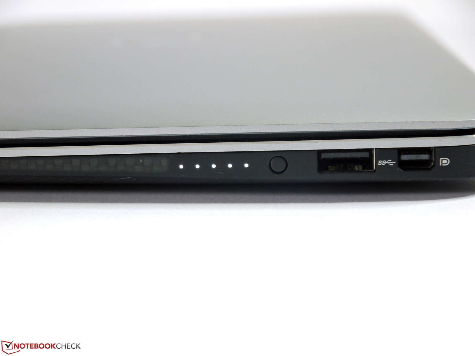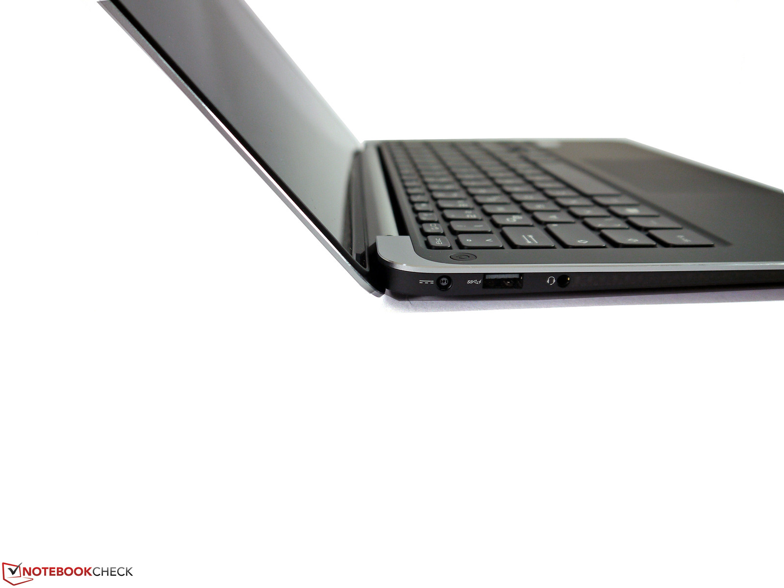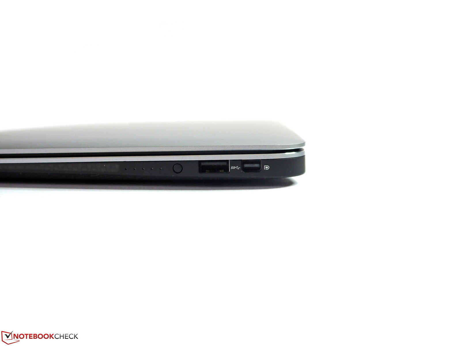 Im Bereich der Ausstattung hat sich Dell am Nötigsten orientiert. 1x USB 2.0 mit Ladefunktion, 1x USB 3.0 zum Anschluss schneller Peripherie und ein Mini-DisplayPort für externe Monitore müssen den Anwendern reichen. Ein Adapter, um den sehr seltenen Mini-DisplayPort auch tatsächlich nutzen zu können, liegt nicht bei. Ebenso bleiben Speicherkarten, Headsets mit zwei Klinke-Anschlüssen und Netzwerkkabel außen vor. Aufgrund der keilförmigen Seitenlinie sind die Anschlüsse alle im etwas höheren hinteren Gehäuseteil zu finden, was für eine geringe Beeinträchtigung durch angeschlossene Kabel sorgt.