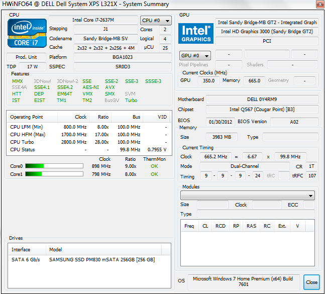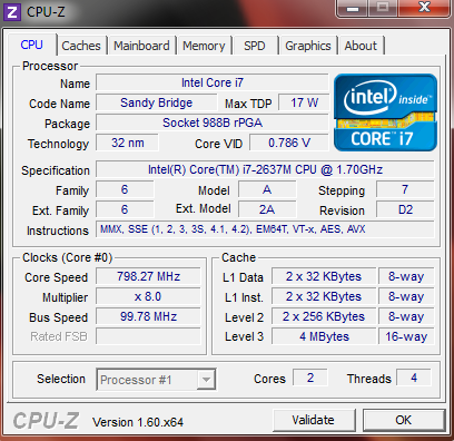 Der Core i7-2637M zählt zu den derzeit schnellsten ULV-Prozessoren auf Basis von Intels Sandy-Bridge-Architektur. Mit einer Taktrate von 1,7 bis 2,8 GHz (Turbo Boost) ordnet er sich zwischen dem Core i5-2467M (1,6 bis 2,3 GHz) und dem Core i7-2677M (1,8 bis 2,9 GHz) ein, mit dem er auch den 4 MByte großen L3-Cache gemein hat. Auch wenn in den nächsten Monaten mit Ivy Bridge eine neue Generation bevorsteht, ist das Featureset mit Hyper-Threading sowie den Befehlssatzerweiterungen AES-NI und AVX auf der Höhe der Zeit. Die TDP der in 32 Nanometer gefertigten Dual-Core-CPU liegt bei sparsamen 17 Watt.