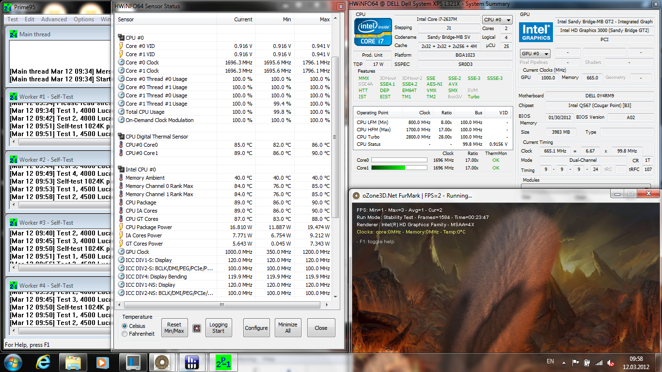 Knapp 90 Grad Celsius erreicht der Core i7-2637M, wenn wir ihn mit Prime95 und FurMark an seine theoretische Auslastungsgrenze bringen. Throttling war in unseren Tests nicht zu beobachten, lediglich der Turbo Boost wird deutlich abgesenkt (etwa 1,8 GHz CPU; 1,0 GHz GPU).