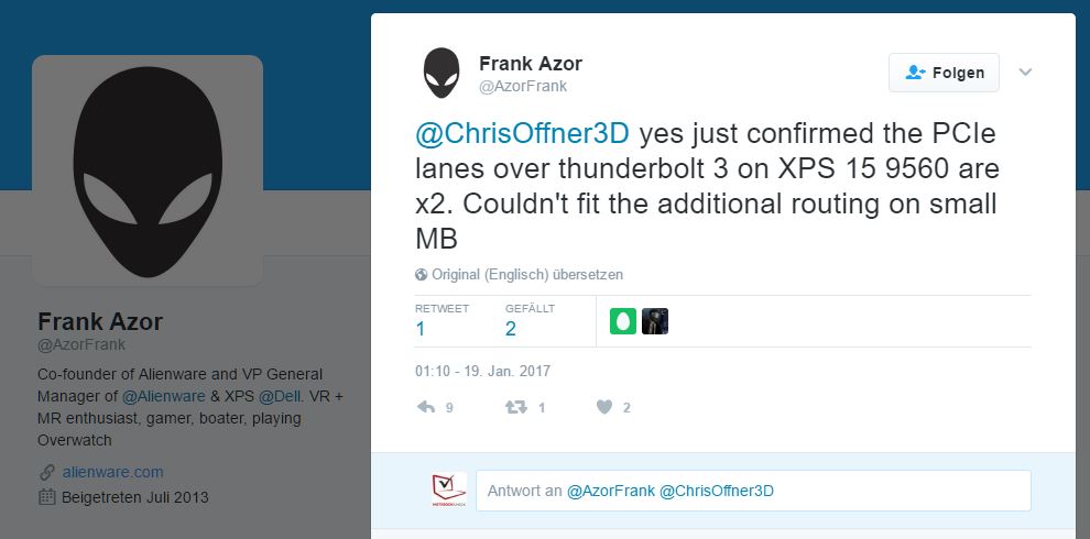 Dem Post eines hochrangigen Dell-Managers zufolge ist der Thunderbolt Port allerdings nur mit zwei (x2) PCIe Lanes angebunden. Dies würde bedeuten, dass die Übertragungsraten des Thunderbolt-Ports nur noch die Hälfte (2 GB/s) einer üblichen Anbindung mit 4 Lanes erreichen können. Problematisch könnte dies etwa beim geplanten Einsatz von externen Grafiklösungen werden, die auf eine entsprechende Bandbreite angewiesen sind. Aktuell bereiten wir einen Test der Asus XG Station 2 vor. Nach Möglichkeit werden wir dann auch das XPS 15 damit testen.