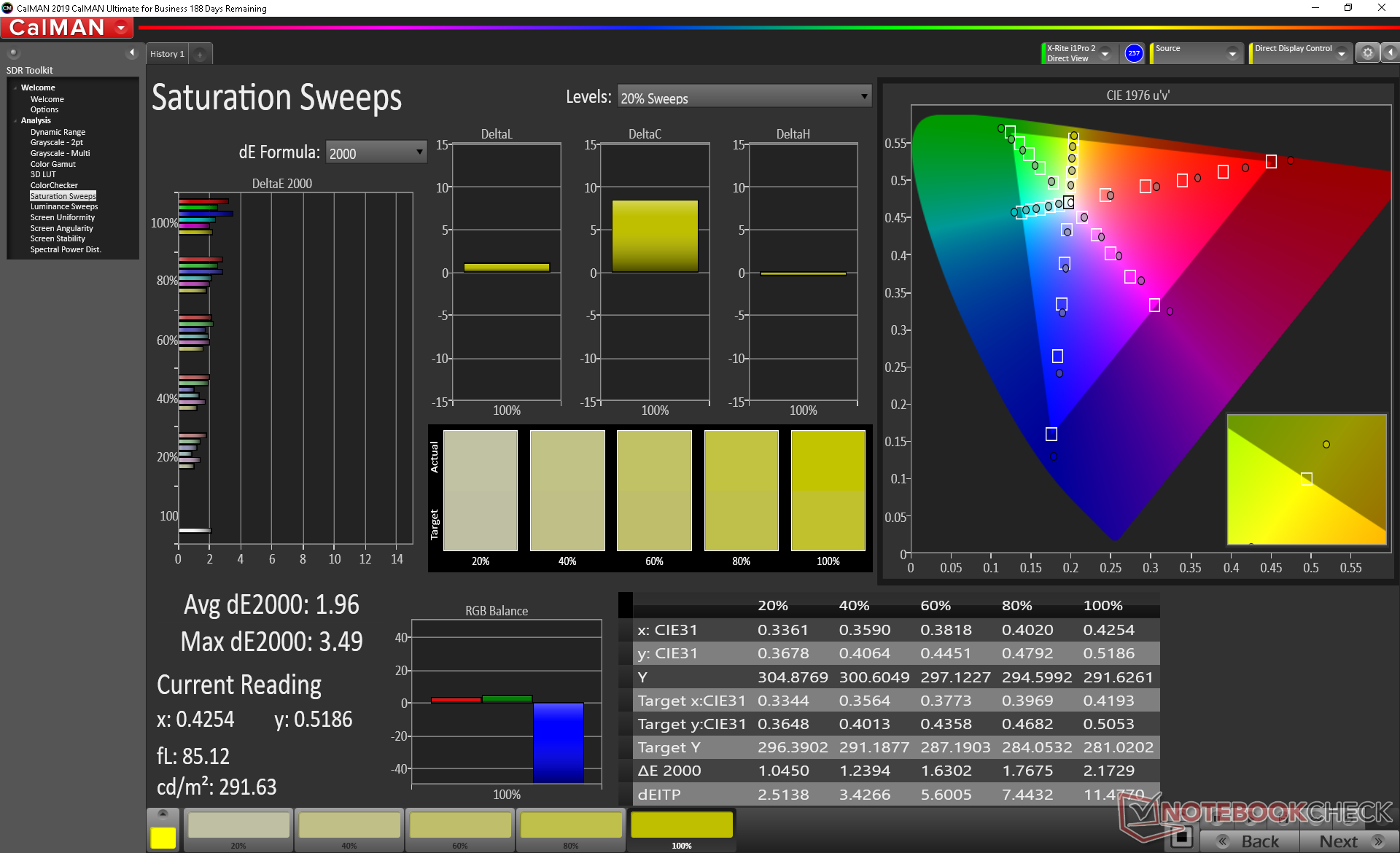 Weitere Messungen mit einem X-Rite-Farbmessgerät bescheinigen dem Panel eine ab Werk bereits gute Darstellung. Die Farb- und Graustufen-DeltaE-Werte konnten wir durch eine nachträgliche Kalibrierung von 3,9 auf 1,1 bzw. 2,9 auf 1,96 und damit nur unwesentlich senken. Mit etwas Feintuning sollten noch bessere Werte möglich sein, wenn man das Panel auf den sRGB-Farbraum einmisst, da es diesen vollständig darstellen kann.