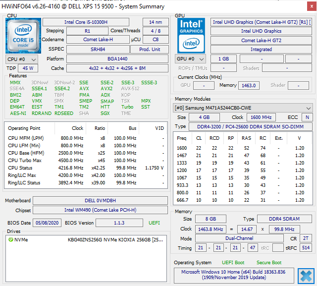 | 86.8 % v7 (old) | 05 / 2020 | Dell XPS 15 9500 Core i5 i5-10300H, UHD Graphics 630 | 1.8 kg | 18 mm | 15.60" | 1920x1200 | |