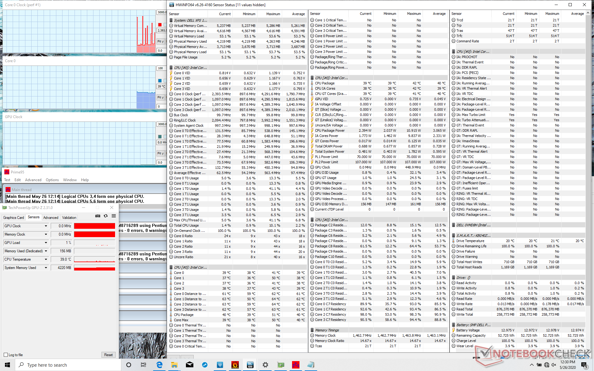 Im Gegensatz zu den meisten anderen Laptops lassen Dell-XPS- und Alienware-Laptops ihre Prozessoren wärmer als 90 °C werden und das XPS 15 9500 setzt diesen Trend fort. Beim Ausführen von Prime95 steigt die Kerntemperatur auf 100 °C und verbleibt dort für wenige Minuten, wodurch in diesem Zeitraum eine hohe Taktfrequenz von 4,2 GHz aufrechterhalten werden kann. Anschließend werden die Lüfter deutlich lauter, um die Kerntemperatur auf 95 °C senken zu können. Dass es dem System gelingt, die CPU auch unter Volllast nicht zu drosseln ist bemerkenswert, allerdings geht dies auf Kosten von sehr hohen Kerntemperaturen und lauten Lüftern.