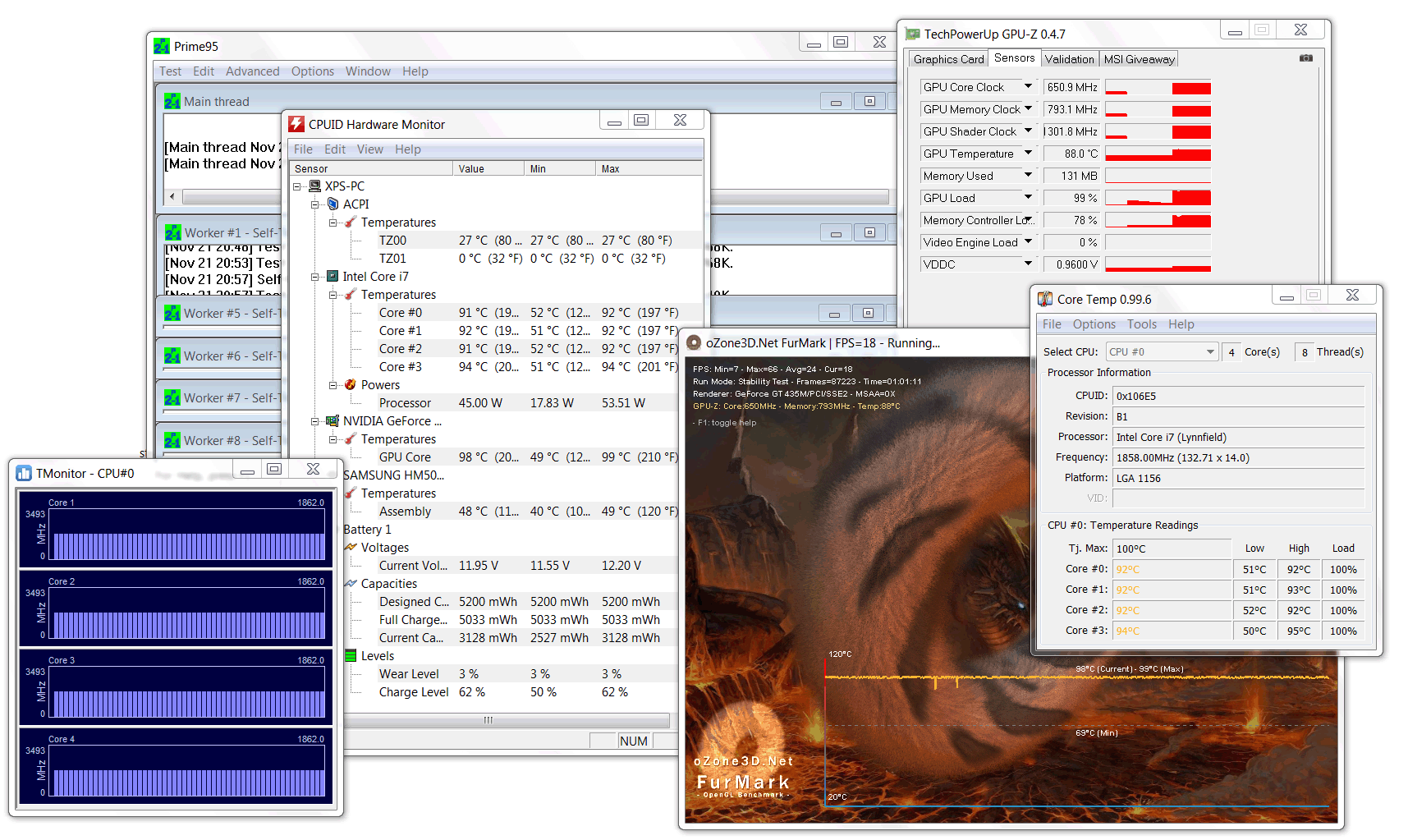 Unter Last erwärmt sich das Gehäuse deutlich, bleibt aber bei typischen 3D-Anwendungen noch im vertretbaren Rahmen. Dagegen erreichen die Temperaturen im mehrstündigen Stresstest Spitzenwerte von 50.8 Grad Celsius an der Unterseite und 43.7 Grad Celsius an der Oberseite. Dabei kann nur der linke Bereich angenehm kühl bleiben. Im Inneren erreichen sowohl Grafikkarte als auch Prozessor maximale Temperaturen von etwa 95 Grad Celsius. Nach Beendigung des Stresstestes ist dennoch keine Drosselung der Leistung erkennbar. Das Ergebnis des unmittelbar im Anschluss ausgeführte 3DMark06 Test weicht nur vernachlässigbar vom Kalttest ab. Dazu ist hinzuzufügen, dass ein Szenario wie beim Stresstest mit andauernder 100% CPU und 100% GPU Auslastung in der Praxis kaum vorkommt.