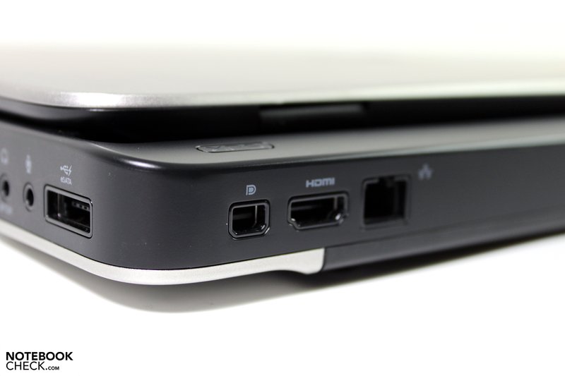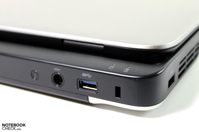 Verglichen mit dem Studio XPS 16 hat sich an der Schnittstellenausstattung nicht viel verändert. Positiv sei gleich zu Beginn die Schnittstellenanordnung, welche das neue Design mit sich gebracht hat, erwähnt. Weder links noch rechts vom Gerät können eventuell dort angeschlossene Kabel den Arbeitsbereich seitlich des Notebooks störend einschränken. Viele Schnittstellen wurden im Vergleich zum vormals getesteten Studio XPS 16 an die Rückseite verbannt. Dort befinden sich die beiden digitalen Bildschnittstellen, ein Mini-Displayport und ein HDMI Anschluss, der Ethernetanschluss, ein Kensington Security Lock Slot, und einer von insgesamt zwei USB-3.0 Anschlüssen. Damit wären wir auch schon bei der zweiten Neuerung im Vergleich zum Studio XPS 16: Die beiden USB-2.0 Anschlüsse wurden durch USB-3.0 ersetzt. Der zweite befindet sich an der linken Seitenkante im hinteren Bereich.