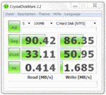 Als Massenspeicher ist im Dell XPS 15 eine Samsung HM500JJ Festplatte eingebaut. Sie bietet 500GB Bruttokapazität, wovon etwa 15 GB als Recovery Partition genutzt werden und 451 GB für Betriebssystem und Nutzerdaten zur Verfügung stehen. Die Festplatte arbeitet mit einer Umdrehungsgeschwindigkeit von 7200U/Min und bringt, aufgezeichnet mit HDTune und CrystalDiskMark entsprechende Leistungsdaten. Alternativ kann sich der Käufer zum Aufpreis von 100 Euro auch für eine größerer 640 GB Festplatte (7200 U/min) entscheiden.