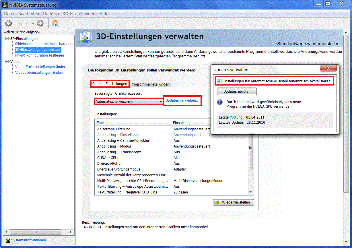 Zudem sollte unter „Globale Einstellungen“, „Updates verwalten“ unbedingt das Kästchen aktiviert sein. In diesem Menü lässt sich auch einfach die globale Einstellung für die bevorzugte Grafikeinheit ändern. Noch komfortabler geht es aber mit der Option „Mit Grafikprozessor ausführen dem Kontextmenü hinzufügen“, die Sie im Reiter „Desktop“ finden. Damit können Sie einem Programm gleich per Rechtsklick eine bestimmte Grafikkarte zuweisen.