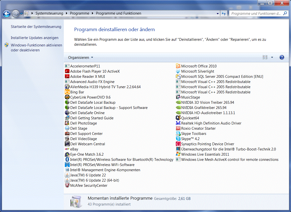 Die Softwareausstattung fällt relativ üppig aus. Abseits von diversen Dell-eigenen Programmen wäre primär die Vollversion von CyberLinks PowerDVD 9.6 zu nennen, die laut Startbildschirm auch 3D-Blu-Rays wiedergeben kann. Um die maximale Geschwindigkeit aus dem System herauszukitzeln und gerade in der Anfangszeit nicht ständig von Pop-Up-Meldungen belästigt zu werden, sollte man sich jedoch von der ein oder anderen Software trennen.