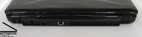 Die gebotenen Anschlüsse und Ports des Gaming Gerätes befinden sich fast allesamt eher im hinteren Bereich an den Seitenkanten bzw. direkt an der Rückseite des Notebooks. Geboten werden vier USB 2.0 Ports, Firewire, S-Video (mit S/PDIF Unterstützung über Dongle) und ein Dual-Link DVI-I Port welcher sowohl den Anschluss eines Monitors via analogem Signal gestattet (mit passendem Dongle) als auch Unterstützung für 30 Zoll Displays (z.B. QXGA, max.2560x1600 Pixel) bietet.