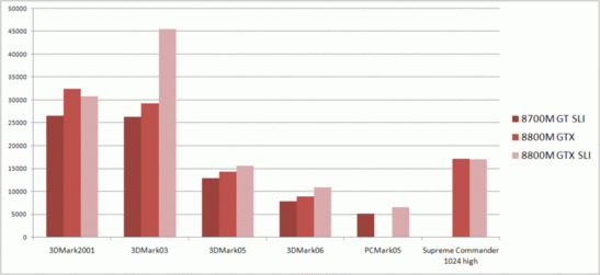 Im Vergleich zu nur einer einzelnen 8800M GTX Grafikkarte (in der Nvidia Systemsteuerung SLI deaktiviert), zeigt sich jedoch nur bei den synthetischen Benchmarks von Futuremark eine deutliche Leistungssteigerung. Bei aktuellen Spielen kommt es stark auf die Unterstützung von SLI an. World in Conflict, Crysis und Company of Heroes profitierten von der zweiten Grafikkarte mit 9%, 8% und 4% Geschwindigkeitszuwachs (überall in der höchsten Detailstufe) am meisten. F.E.A.R. und Supreme Commander zeigten etwa die selbe Leistung und Doom 3 bremste die 2. Grafikkarte sogar aus.