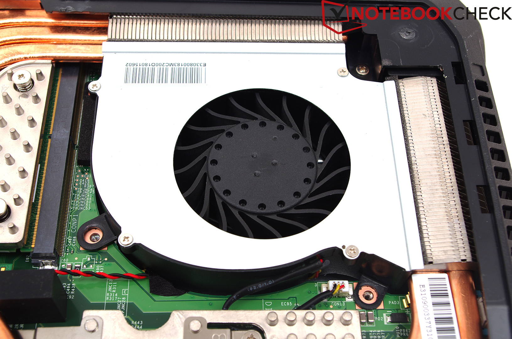Ebenso gut erreichbar sind die primären RAM-Bänke, die sich unmittelbar am Kühlsystem befinden (zwei weitere unter dem Tastatur). Genau wie beim MSI GT70 teilen sich die Grafikkarte und der Prozessor einen Lüfter, der die Abwärme über ein Heatpipe-System nach außen befördert. Der Lüfter, die CPU und GPU lassen sich bei Bedarf ausbauen. Dies vereinfacht mögliche Reinigungsvorgänge erheblich. Wer die Tastatur für Reinigungszwecke entfernen möchte, findet eine Kurzanleitung beim Test des MSI GT70.