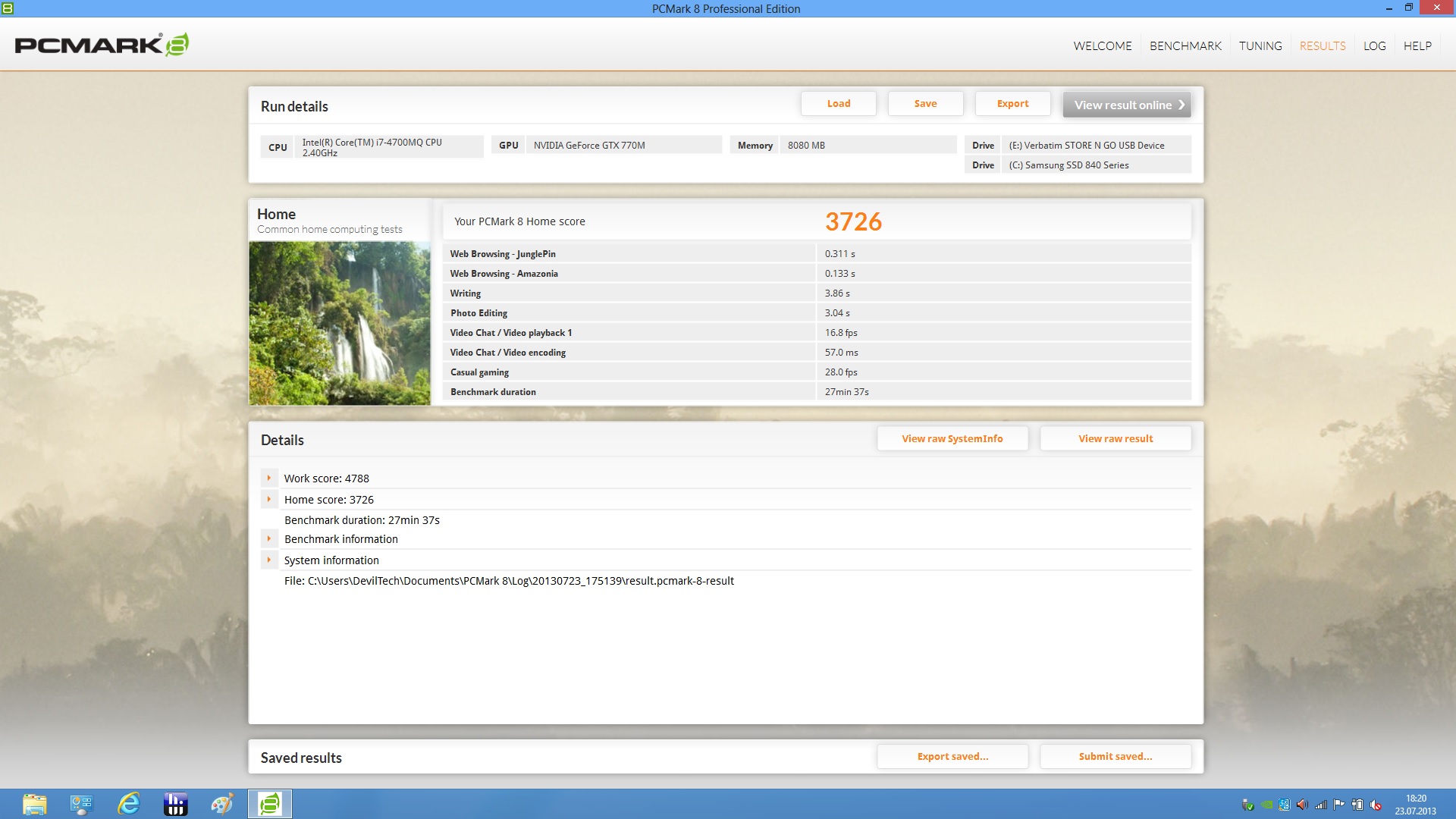 Die Kombination aus flottem Prozessor, High-End Grafikkarte und schneller SSD verhelfen dem Fragbook DTX zu Spitzenpositionen bei den PCMarks. Mit 5.664 Punkten reiht sich der 17-Zöller im oberen Bereich der Benchmarkliste ein. Ein etwas besseres Resultat konnte das Schenker XMG A523 (15,6-zölliges DTR) herausholen. Dank der potenteren Crucial SSD setzt es sich mit 5.944 Punkten 5 % vor das Deviltech-Gerät. Eine erhebliche Mehrleistung machen diese Punkte jedoch nicht aus. Das Fragbook DTX verrichtet seine Arbeit selbst unter höchster Auslastung mit Prime95 noch hervorragend und verlustfrei.