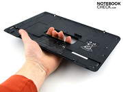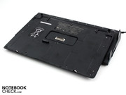 Das Aufsetzen des Gerätes vollzieht sich ohne Riegel. Das heißt: Notebook hinten an die zwei Stoß-Nippen anlegen, ablegen, fertig. Das Subnotebook kann nicht verrutschen, zwei Sicherungsfedern (Silber) ragen in die Base-Unit hinein und verhindern das Wegrutschen.