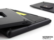 Am Notebook macht der Slice eine gute Figur, auch wenn er farblich nur zu dem schwarzen Vaio SB passt. Die Arretierung besitzt auf der Verschluss-Seite zwei Metall-Haken. Die Einhängung auf der anderen Seite besteht aus Kunststoff. Damit der Slice nicht versehentlich entriegelt wird und abfällt, muss er in zwei Schritten gelöst werden (Entriegeln, Lösen). Das rechteckige Loch in der Mitte des Slice dient der Docking-Station. Der Slice würde ohne die Aushöhlung den Port versperren.