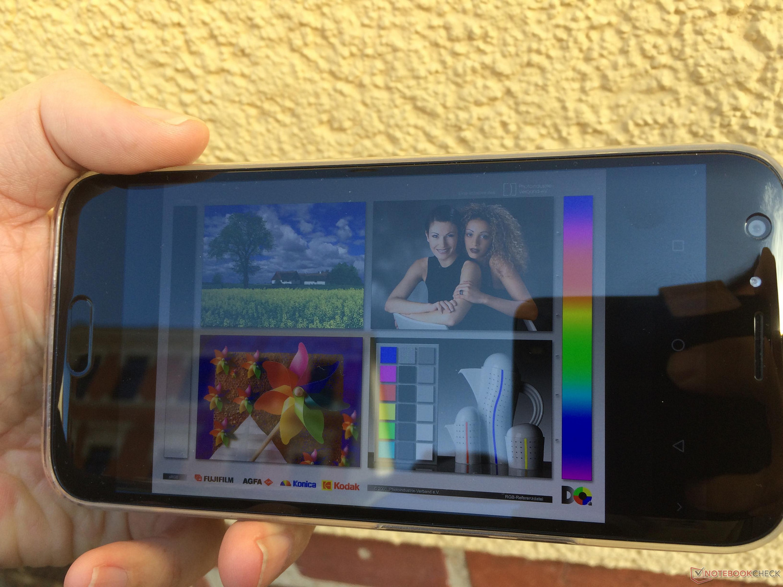 Das verwendete IPS-Display weist eine hohe Helligkeit von bis zu 540cd/m² auf. Damit ist es selbst bei direktem Lichteinfall noch einigermaßen ablesbar. In schattiger Umgebung stellt die Helligkeit kein Hindernis bei der Nutzung dar. Allerdings spiegelt das Glas sehr stark und auch die abgerundeten Ecken sind nicht besonders hilfreich. .