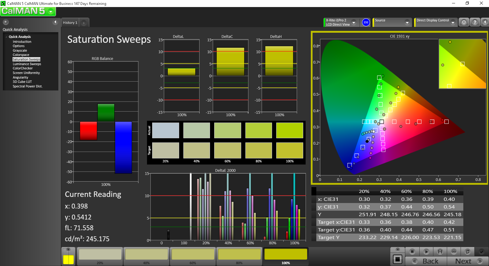Wie man es bei einem günstigen Gerät erwarten kann, sind die Farben generell nicht sehr akkurat. Die Farbtemperatur ist deutlich zu kühl. Die Graustufen zeigen Abweichungen und Cyan- sowie Blautöne weichen über alle Sättigungsstufen am höchsten vom Idealwert ab. Diese Probleme konnten wir bereits beim Y100 feststellen, was aufgrund der identischen Displays keine Überraschung ist. Konkurrierende Geräte wie das HTC Desire 626G oder LG G4c haben insgesamt ausgewogenere Farben.