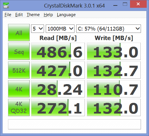 Wir erwähnten bereits, dass das X7 bis zu fünf Speicherlösungen aufnehmen kann. Laufwerke mit demselben Steckplatz können dabei als RAID 0/1/5/10 konfiguriert werden, falls gewünscht. Unser Testgerät nutzt eine 120 GB Crucial CT120M500SSD3 mSATA-SSD als primäre Festplatte und eine 1 TB Hitachi Travelstar 7K1000 HTS721010A9E630 (9,5 mm) für große Datenmengen. Die Crucial SSD zeigt typische SATA-3-SSD Transferraten beim sequentiellen Lesen um die 500 MB/s in CrystalDiskMark und relativ geringe 512K Transferraten (Schreiben), die mit der alten Intel SSD 320 vergleichbar sind. Die Werte für 4K-Blöcke sind allerdings erstaunlich hoch mit 110,7 MB/s, die Performance bei kleinen Datenblöcken ist also überdurchschnittlich hoch.